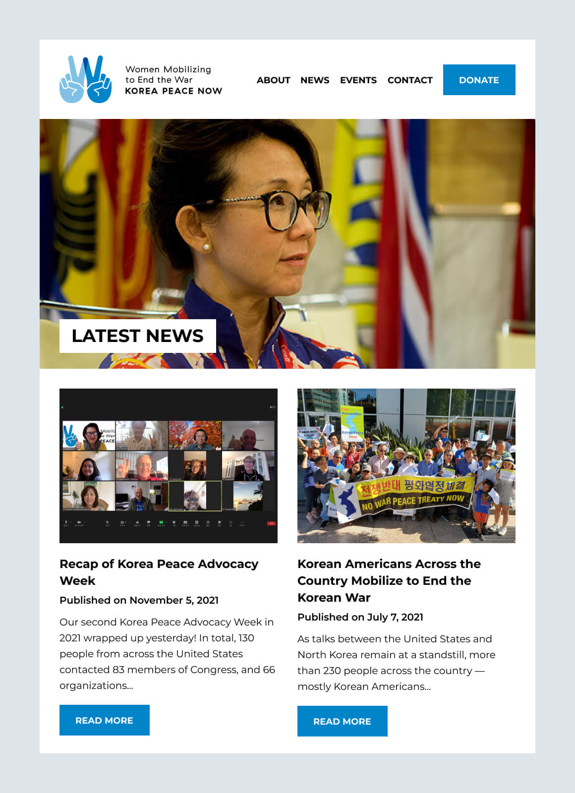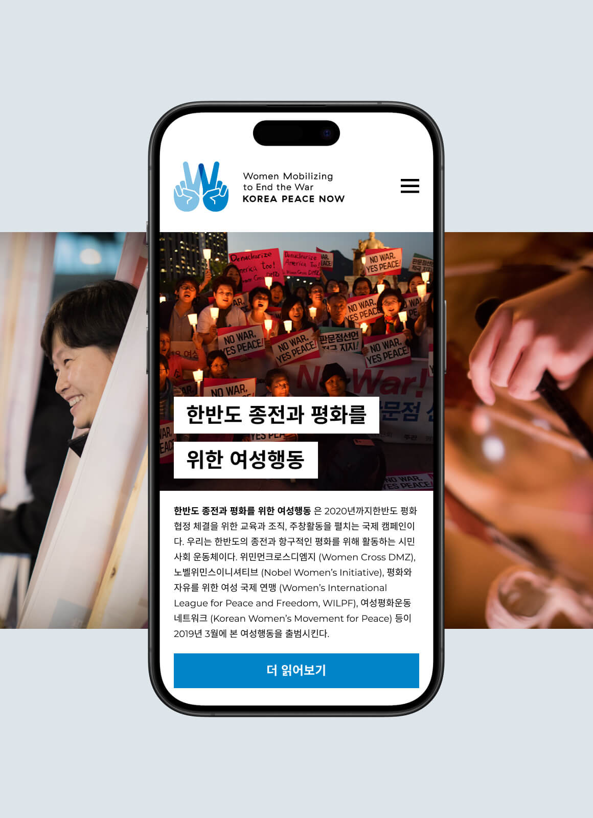 Korea Peace Now! Women Mobilizing To End The War is a nonprofit, global coalition of women's peace organizations—including the Nobel Women’s Initiative, Women’s International League for Peace and Freedom (WILPF), Women Cross DMZ, and the Korean Women’s Movement for Peace—working to educate, organize, and advocate for an end to war and establish lasting peace on the Korean Peninsula. I joined as a freelance contributor to design and launch a website, in both English and Korean, for news, resources, and donations.