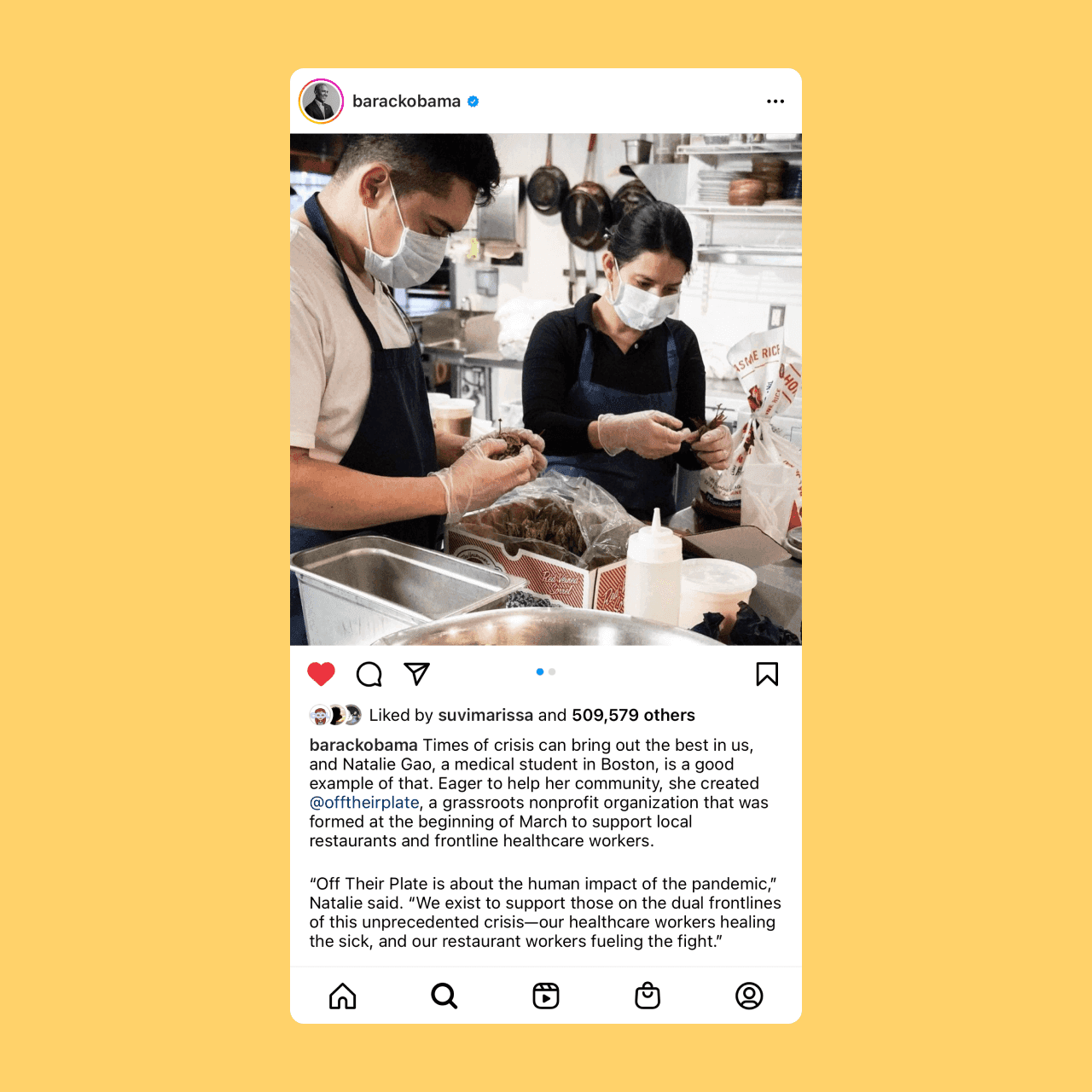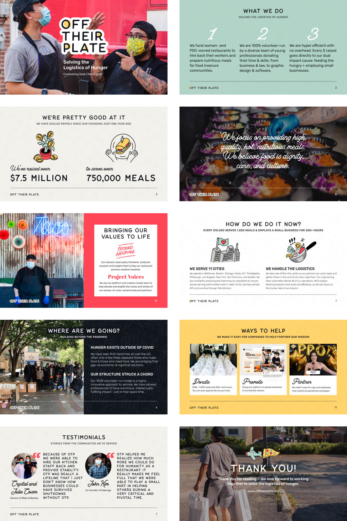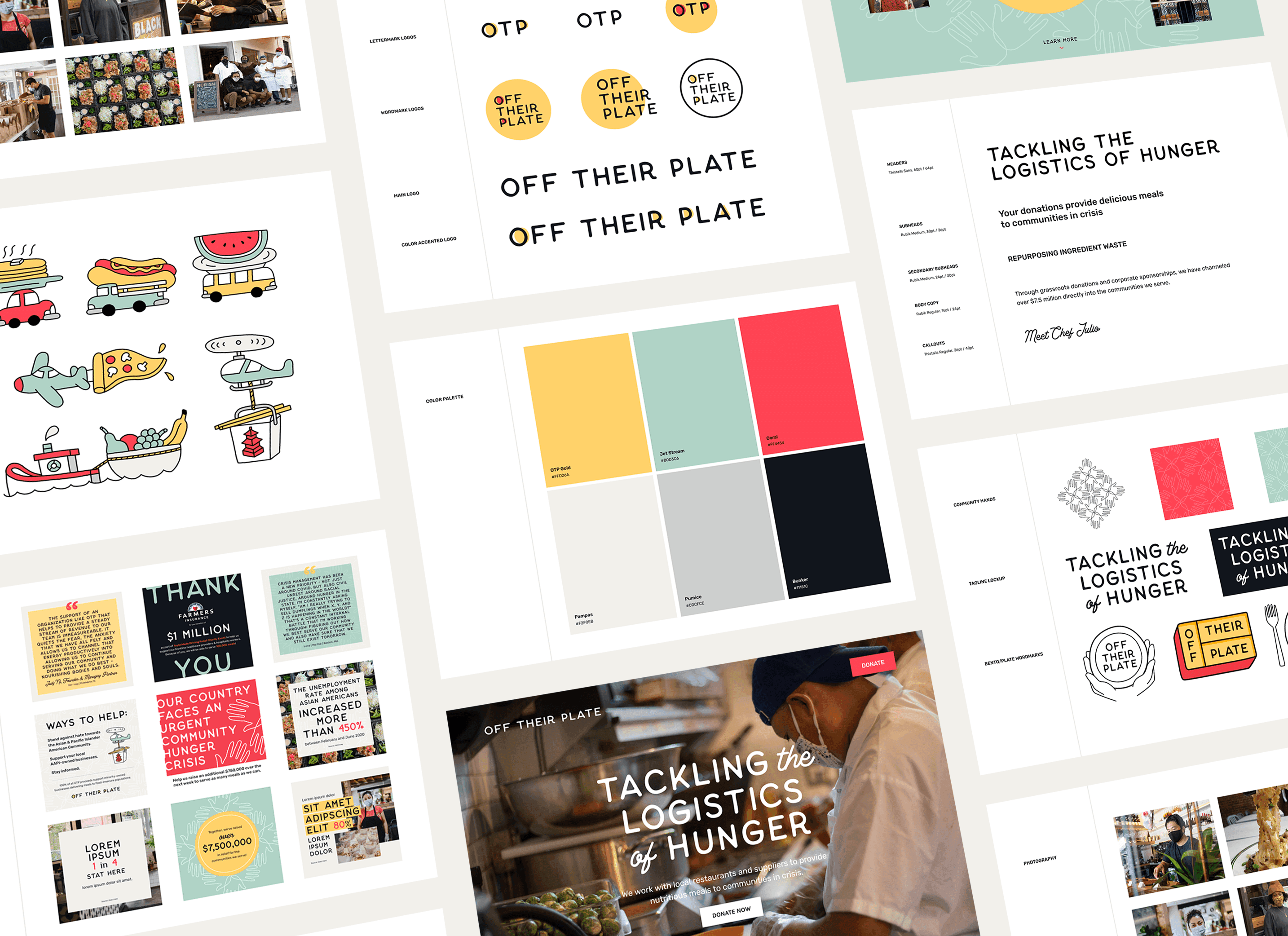 During COVID, I joined a group of brilliant friends to build Off Their Plate, a 100% volunteer-run economic relief organization working to alleviate community hunger and economic challenges of the pandemic. I served as Creative Lead, establishing the full OTP brand book and codifying a logo, color scheme, type system, and aesthetic principles capturing the voice of the organization: hopeful and bold, with a touch of whimsy reflecting the optimism of our work. (Moving food illustrations were created by the brilliant Danny Miller.) Throughout our operations we raised over $8 million, supporting 170 restaurant partners and facilitating the delivery of 875,000 hot, nutritious meals to communities experiencing food insecurity in 11 cities across the US. Here you’ll find the brand identity of our org expressed across the website design, social, fundraising and outreach materials—and even shouted out by President Obama.